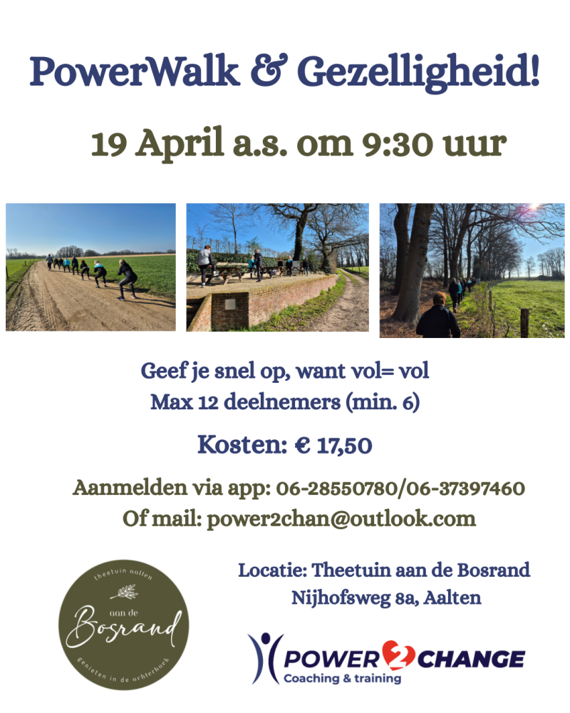 PowerWalk is een sportieve wandelvorm waarbij je in een stevig tempo loopt, vaak met leuke oefeningen tussendoor. Het is laagdrempelig, effectief en geschikte voor alle leeftijden en niveaus. We sluiten de wandeling af met een gezellig kopje koffie/thee, een sapje en iets lekkers.